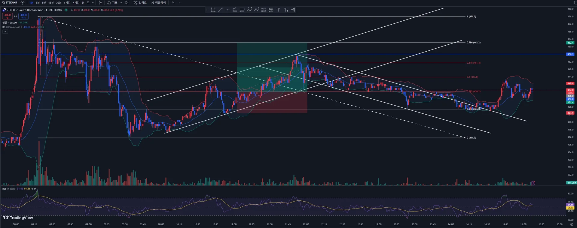 2. 12시 18분에 단기추세선 441을 깨고 하락하고 0.382가 지지선으로 작용하는지 확인하는 것 보려다가 참지 못하고 수익을 조금?이라도 보고자 437에 그냥 매도하고 말았습니다.