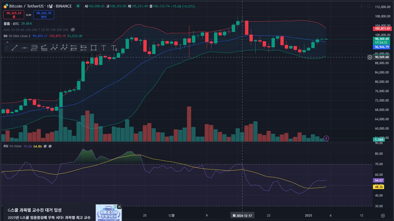 볼린저밴드 하단 진입하여 상승을 예상하여 매수하였습니다.