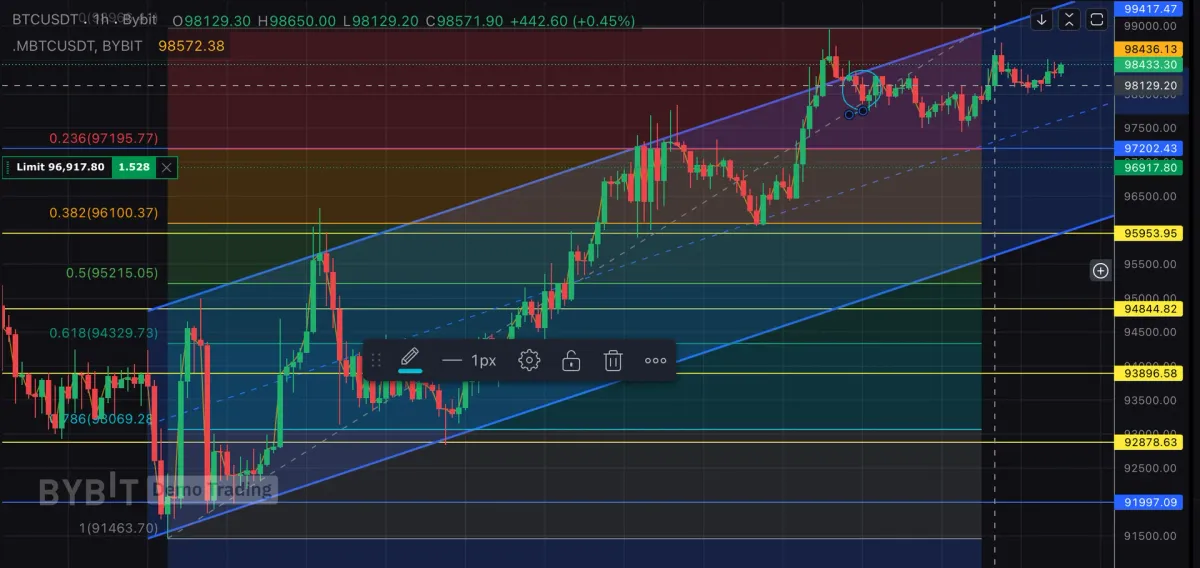 채널 중단과 상승분의 되돌림 0.236부근인 곳에서 반등이 나올 것으로 예상하여 롱 지정가를 걸어보았습니다.