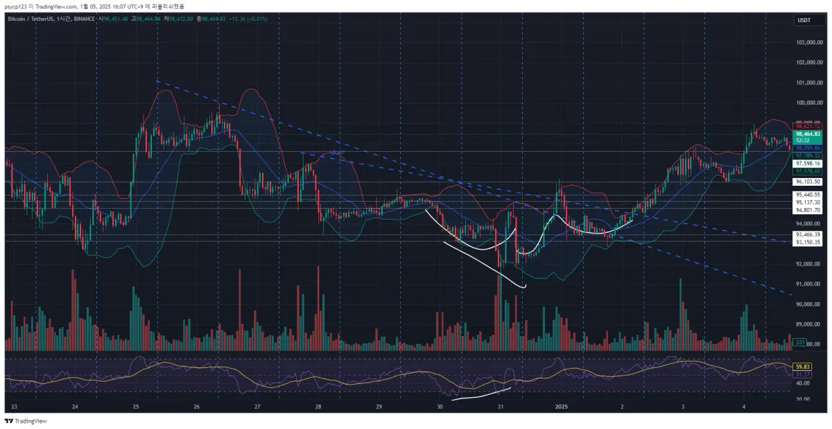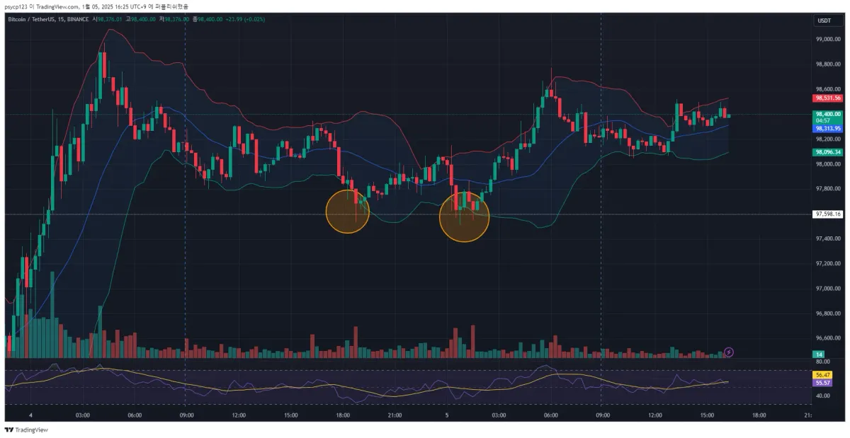 추세선 재돌파+ 저항선 돌파+ 역해드앤숄더+ rsi 다이버젼스로 상승추세임을 판단하고 토요일 18시 45분 경에 저항선이 지지선이 되는 부분 관찰 이후 15분 볼린저밴드 아랫선에서 두 번 지지받는것 확인후 일요일 1시 45분경에 매수, 볼린저 밴드 윗선에서 청산완료 했습니다.