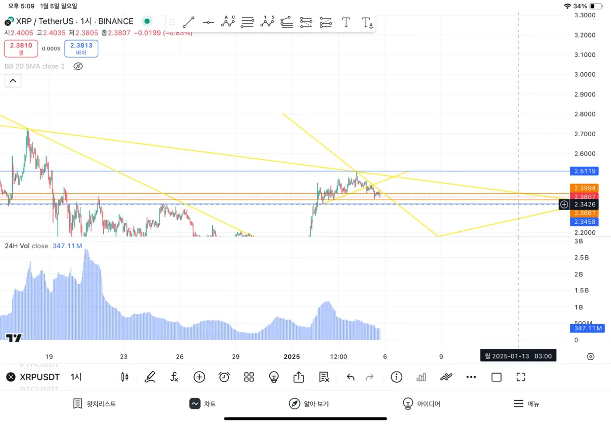 추세선과 지지저항선을 그려본 결과, 현재는 큰 변화없이 유의미한 움직임을 보이고 있으며, 직전 지지선 돌파 후 하락 추세를 보여 2.34선에 도달후 하락 추세선을 돌파할 경우 약간의 상승을 보일것으로 예상되어 하락 추세선 돌파 후 방향성을 본 뒤 매수타점을 정해볼 예정입니다.