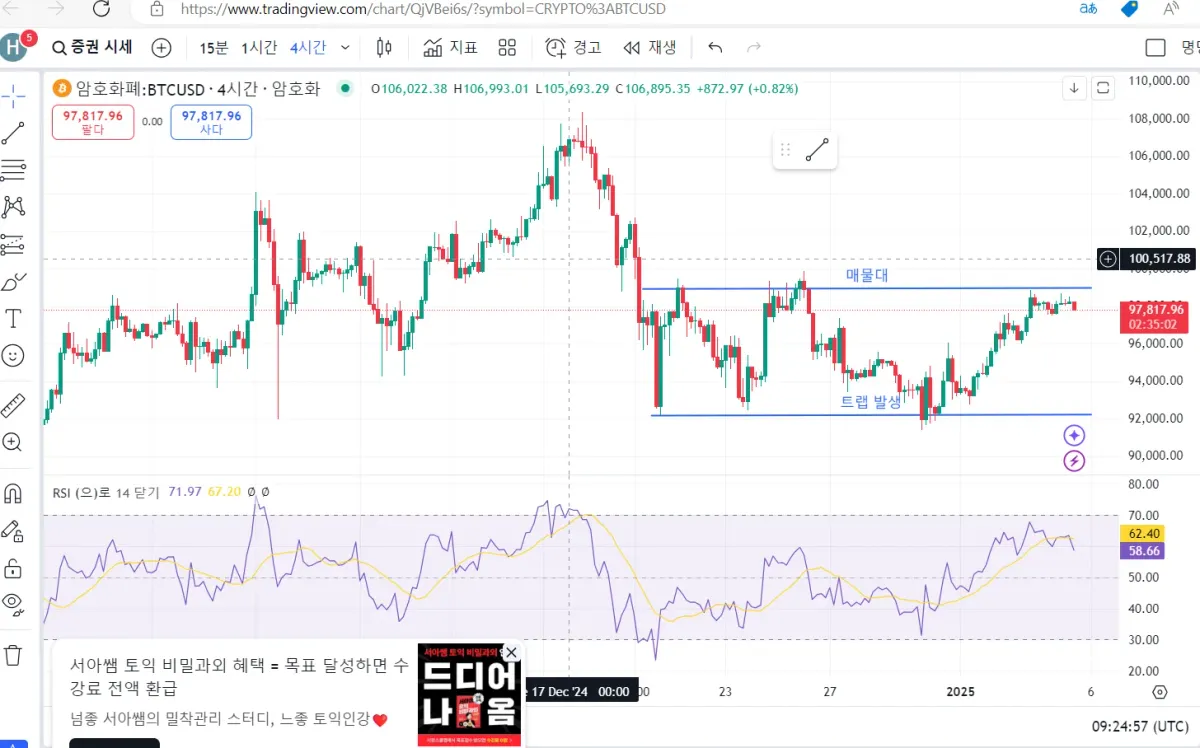 비트코인 차트를 보다가 채널 하단에서 트랩을 만들면서, 터치 하는 것을 인지하고 롱 포지션에 들어감