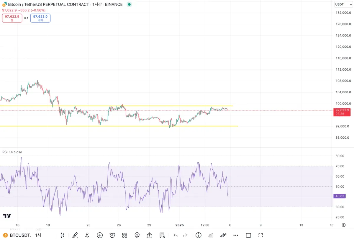 비트코인 1시간 차트에서 rsi지표 추가와 지지와 저항으로 생각되는 부분도 함께 표시해 보았습니다.