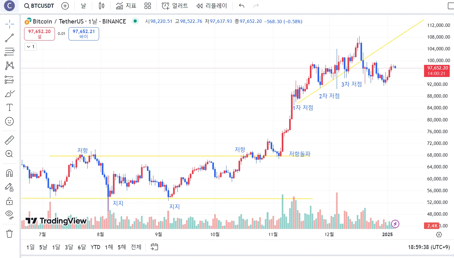 저항이 곧 지지가 되는 것이 재미있었고 추세선 등 찾아보는게 어려웠습니다~