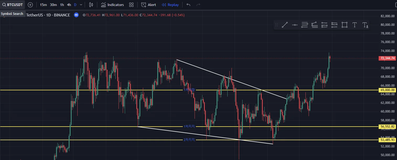 마지막 추세선 캔들까지만 보고 소폭 하락 추세라고 생각했는데 1차 저항선을 뚫은 이후에 잠깐 올라왔다 다시 내려가는데 두번째에는 뚫고 올라가네요