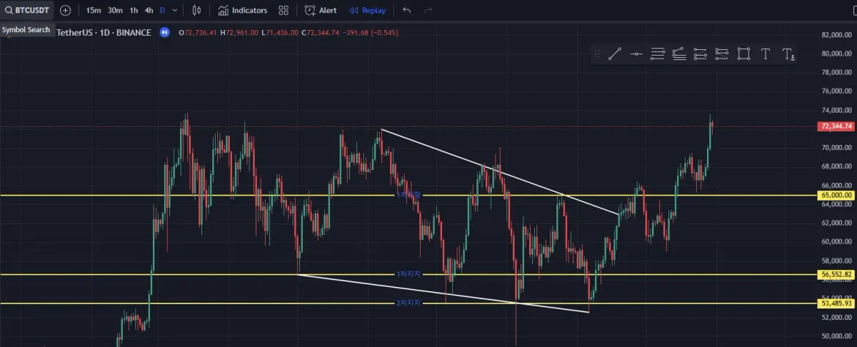 마지막 추세선 캔들까지만 보고 소폭 하락 추세라고 생각했는데 1차 저항선을 뚫은 이후에 잠깐 올라왔다 다시 내려가는데 두번째에는 뚫고 올라가네요