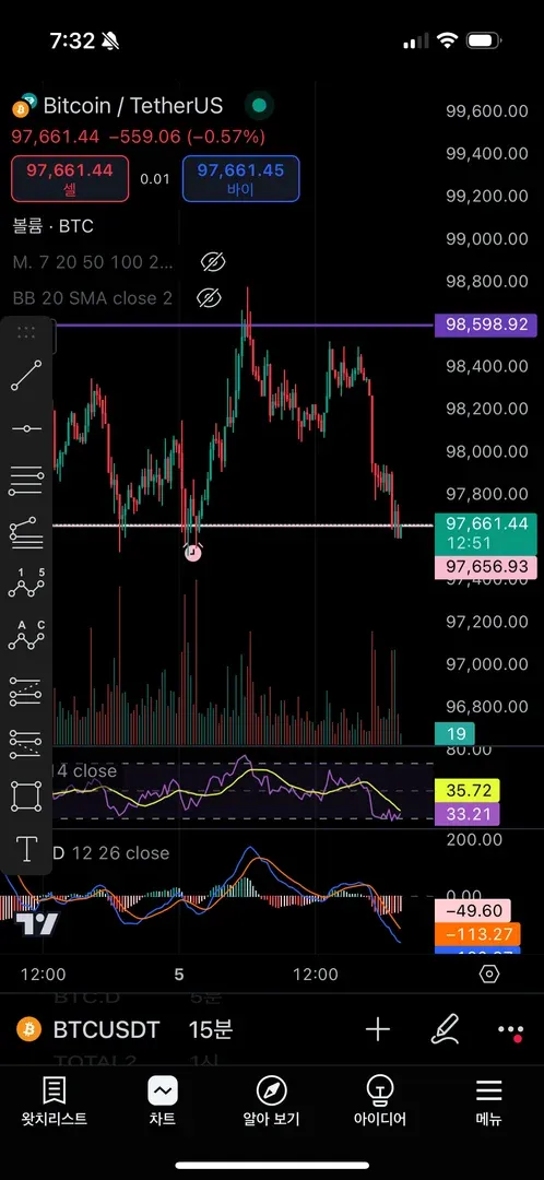 비트코인 15분봉 기준으로 지지와 저항 체크 후 지지라인 리테스트 확인 후 알트코인들 매수함 저항라인에서 2-4%익절