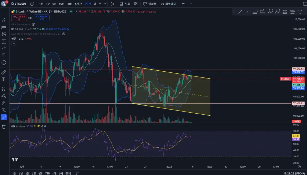 비트코인 4시간봉 기준으로 보았을 때 그림처럼 지지선과 저항선이 그어졌습니다.