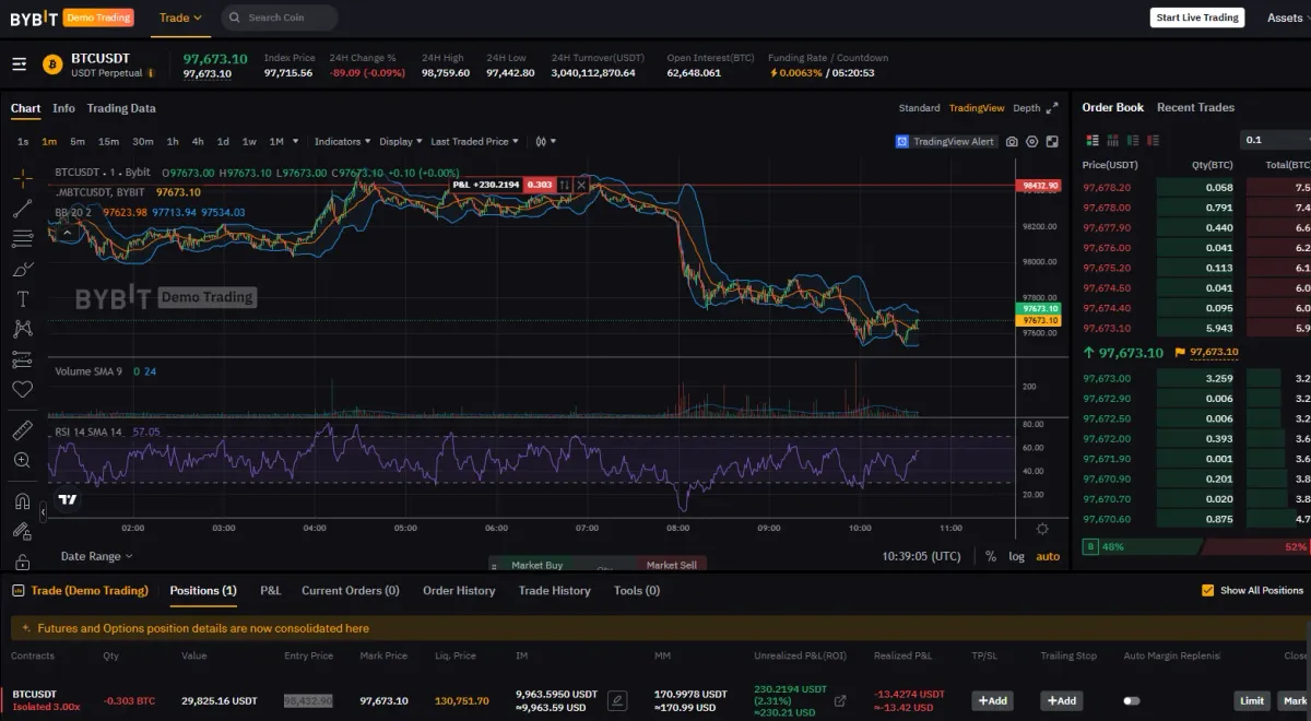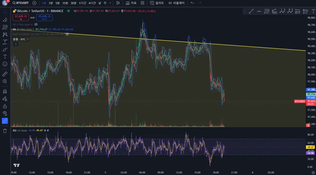 아니나 다를까 1월 4일에서 1월 6일까지의 차트가 하락인 것을 확인하였고, 1분봉 기준으로 볼린저밴드 상승 이탈 마감을 확인, 98,432.90에 3배 숏포지션을 진입하였습니다.
