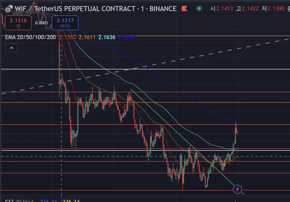 Wif 코인입니다. 더블 바텀 확인하고 피보나치 0.5에서 익절 했습니다