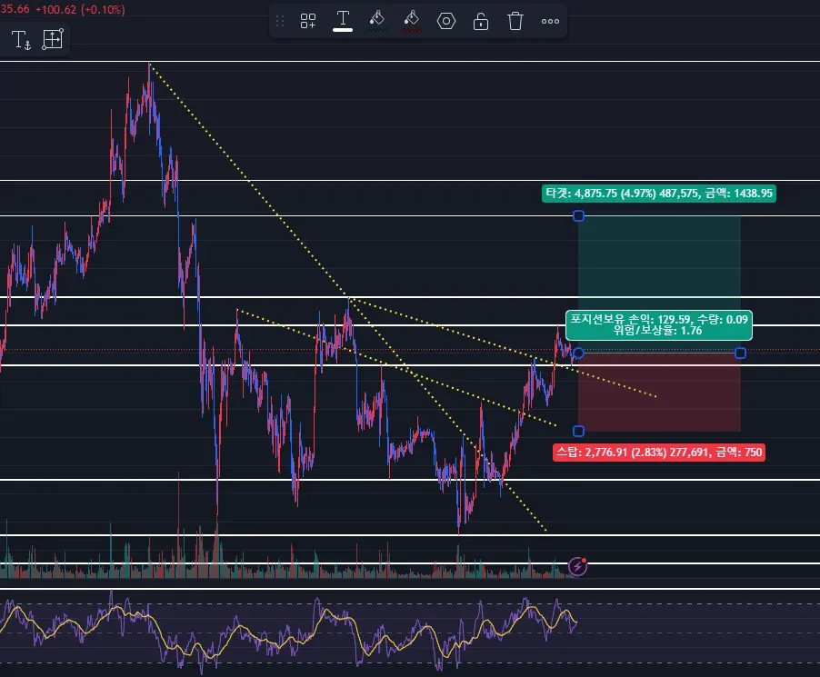 비트코인 1시간봉 차트를 분석 후 단기적으로 상승을 기대해볼 수 있는 자리라 판단되어 롱포지션 진입 했습니다