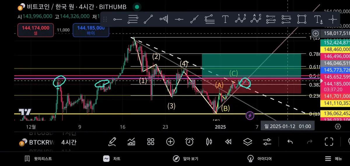 빗썸 가입후 테스트로 매수한 145,652,607 지점에서 매도 손절 시점을 잡아봤습니다 피보나치 0.23, 0.38지점을 지지점으로 보고 0.78에서 매도, 하락시 0.23구간에서 손절을 잡았습니다