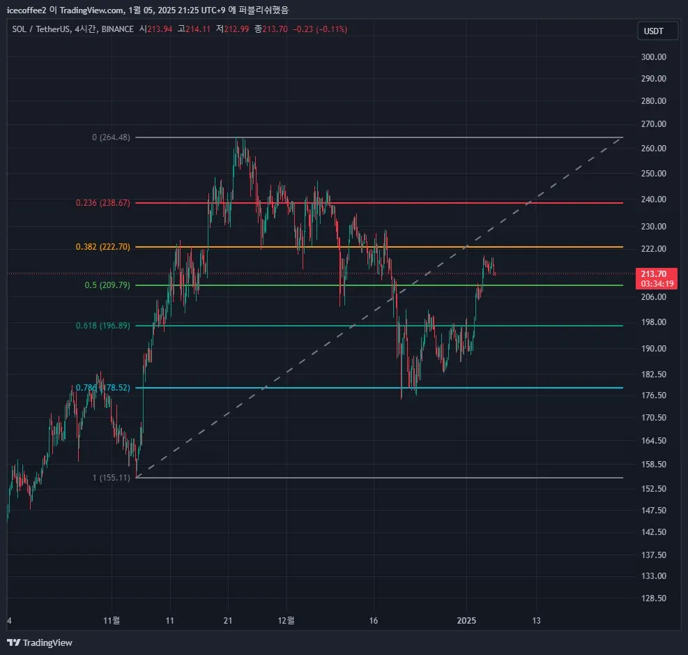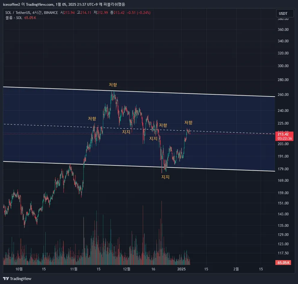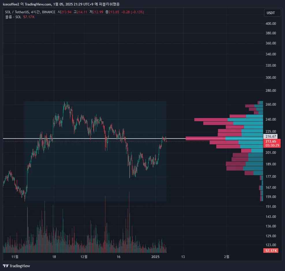홀딩 근거: 피보나치상 0.5 구간의 저항을 맞다가 돌파를 해주었고 0.382구간에서 부분익절을 해야하나 고민중이다. 또한 빗각에 대하여 채널을 작도해봤을 때 (1) 현재 구간에서 채널 중단의 저항을 받고 있다는 것을 알 수 있다. (3) 고정 볼륨 프로필을 참고했을 때 주요 매물대이기도 하다. 하지만 아직 불장이 끝나지 않았다고 생각하는 점과 고점대비 30% 이상 하락했기 때문에 178 구간이 단기 저점이 될 가능성이 높다고 생각하여 조금 더 홀딩해 볼 생각이다. 따라서 (2)를 보면 다음과 같은 매물대에 형성된 것을 알 수 있는데 해당 매물대 밑으로 돌파된다면 약익절로 포지션을 마무리할 예정이다.