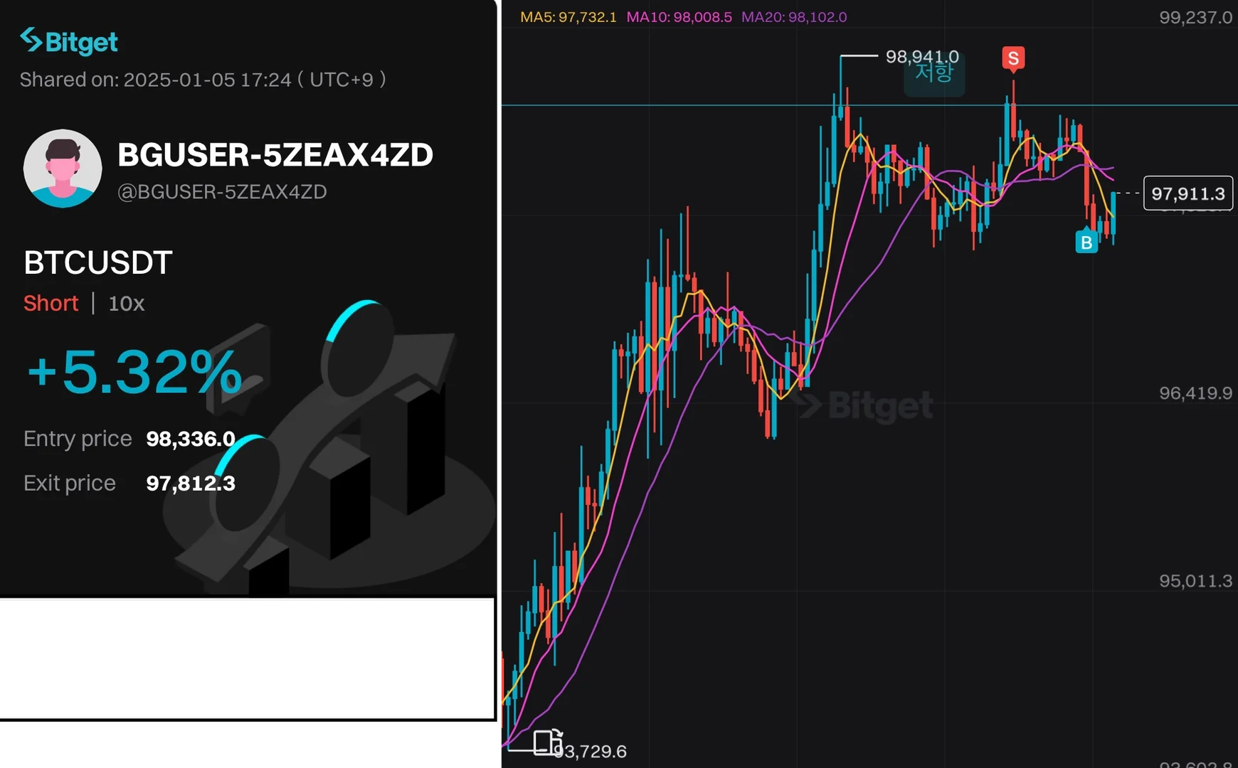 지지와 저항 개념으로 접근하여 2회차 저항이후 매수거래량이 감소하는 것을 보고 숏으로 판단하여 포지션 잡아보았습니다.