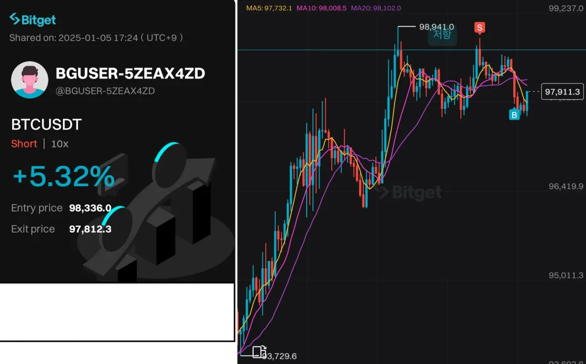 지지와 저항 개념으로 접근하여 2회차 저항이후 매수거래량이 감소하는 것을 보고 숏으로 판단하여 포지션 잡아보았습니다.