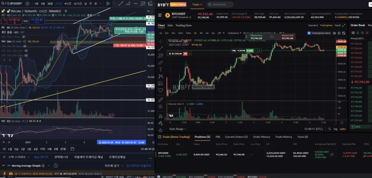 (좌) 트레이딩 뷰 작도 (우) 바이비트 데모 트레이딩
