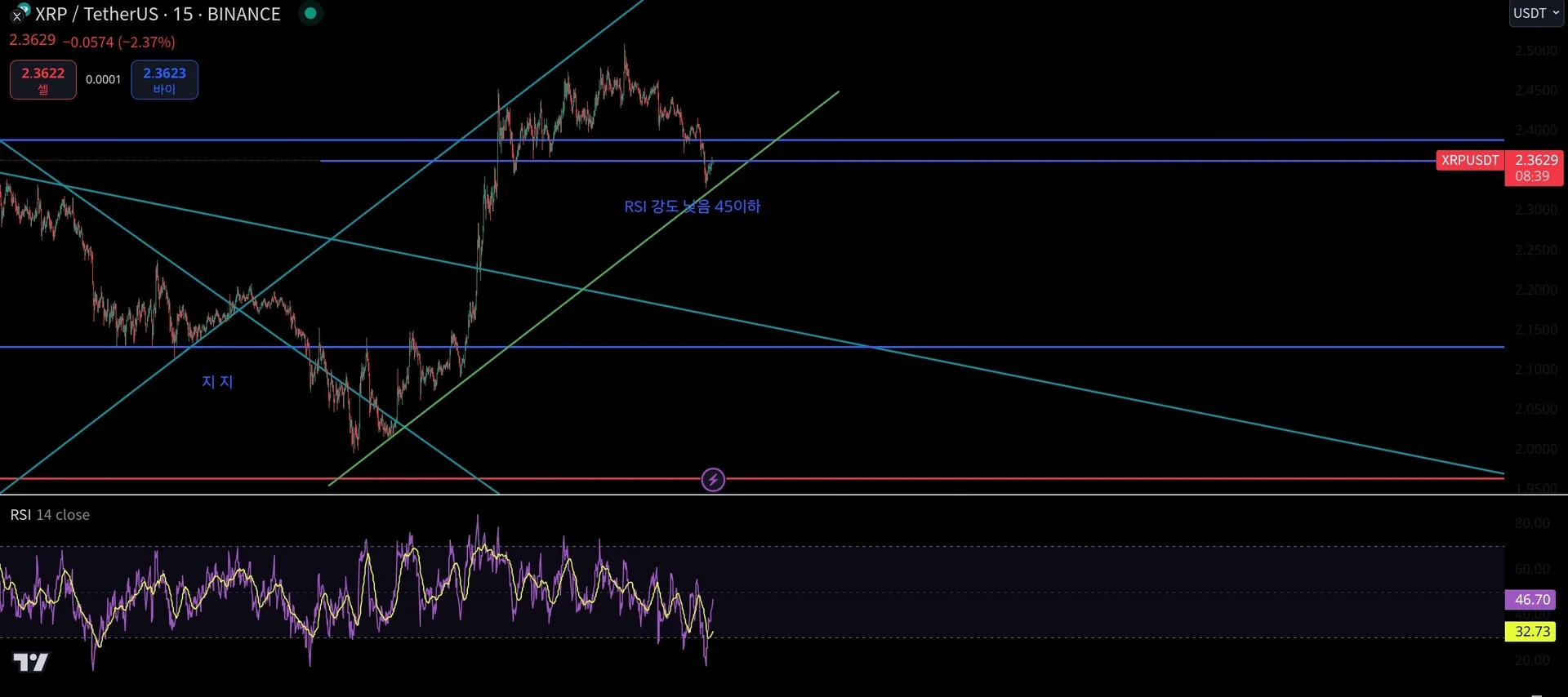 RSI 강도지수가 45미만으로 형성되고 있고 점차적으로 낮아지는 것으로 봐서 곧 RSI 가 낮아지고 금액이 상승하는 다이버전스가 나올수 있을 것 같습니다.