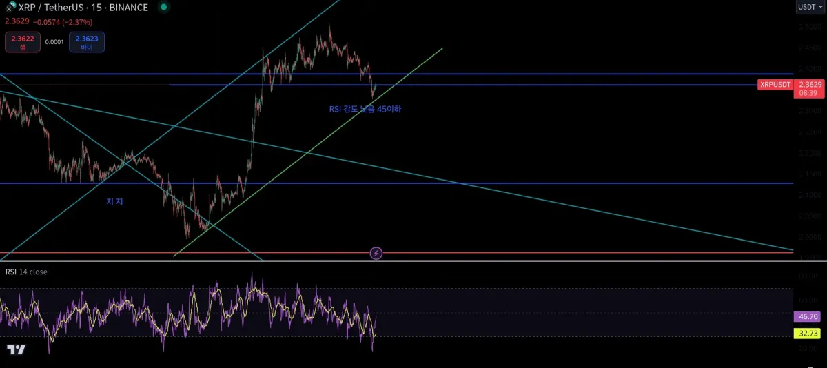 RSI 강도지수가 45미만으로 형성되고 있고 점차적으로 낮아지는 것으로 봐서 곧 RSI 가 낮아지고 금액이 상승하는 다이버전스가 나올수 있을 것 같습니다.