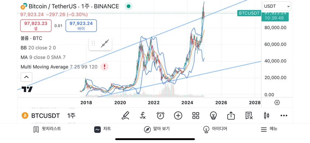 컴퓨터를 할 시간이 되지 않아 핸드폰 트레이딩뷰를 켜서 주봉 기준으로 표시해보았습니다.