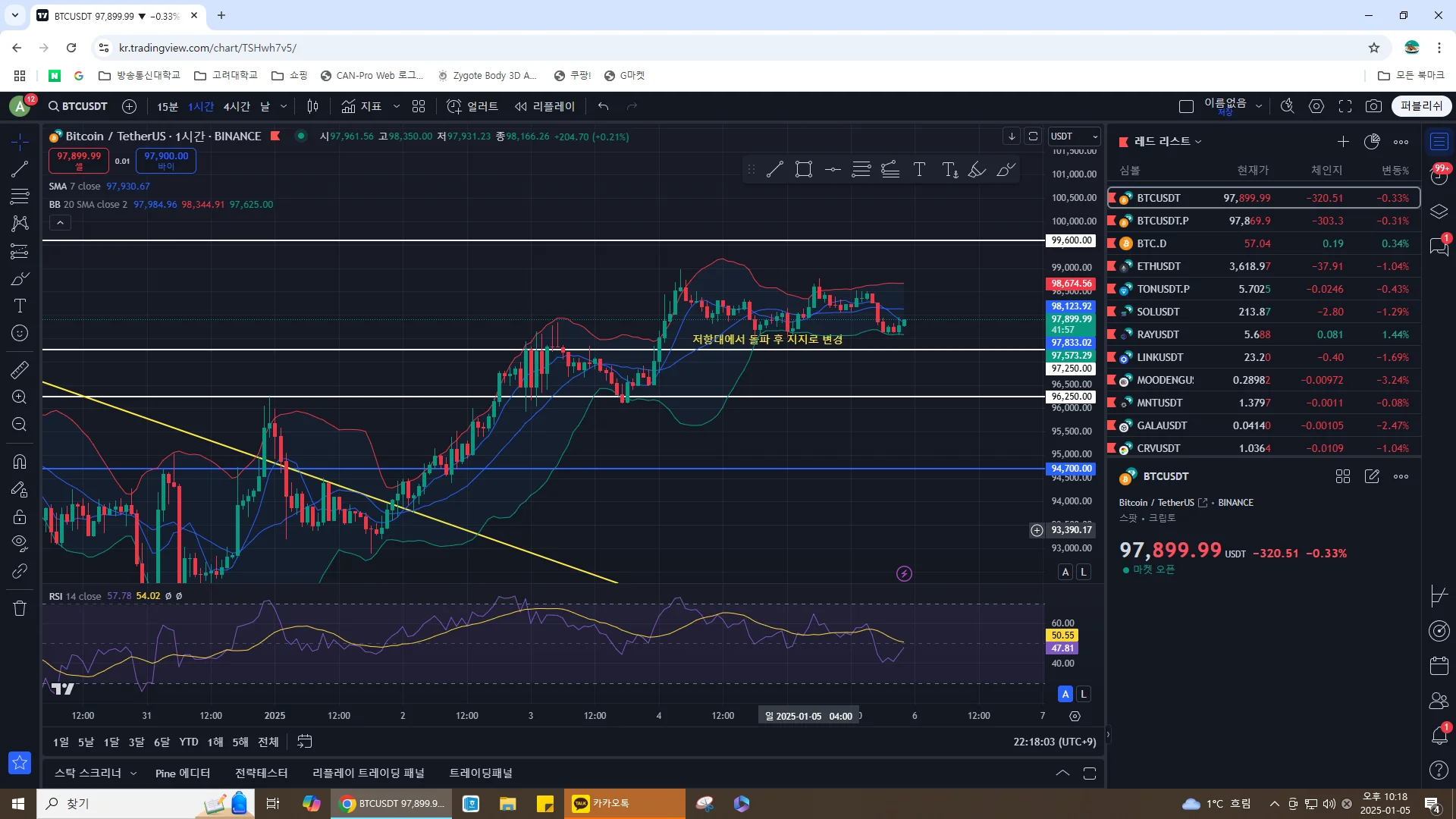 일단 98200에 진입을 하였지만 97250에서 지지를 하는지, 아니면 버티지 못하고 이 지점 캔들마감에서 하락한다면 손절을 생각해두고 있습니다.