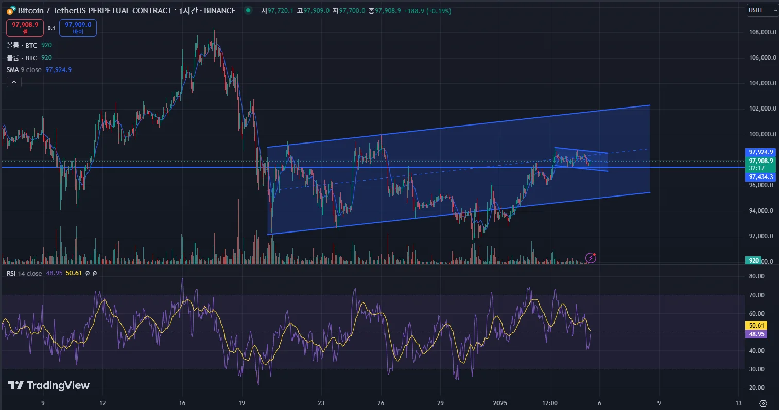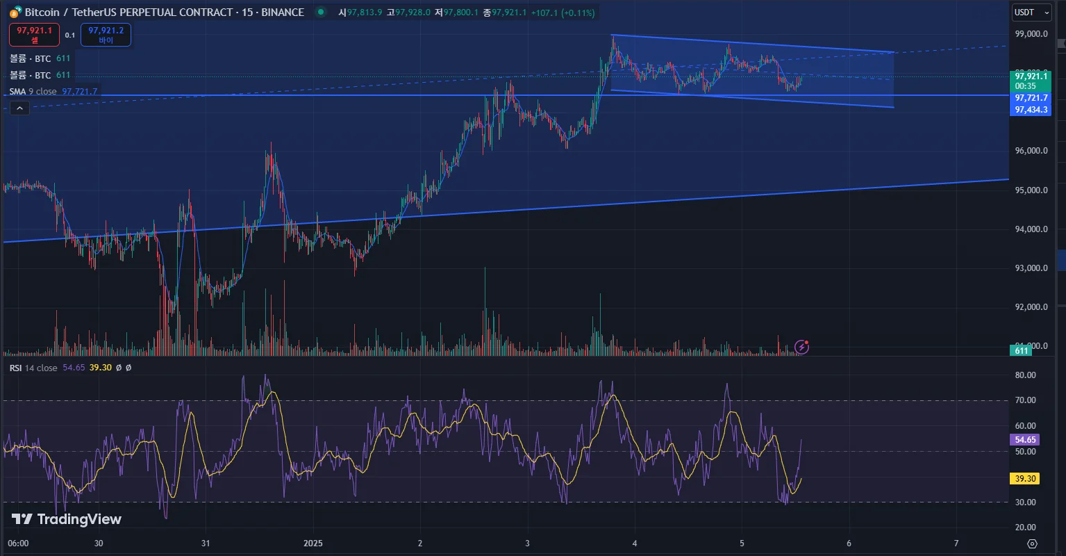 비트코인 1시간봉 15분봉이고 아직 체결은 안되었고 1차 매수는 15분봉 하락채널 하단부근과 지지부근인 97421정도에 1차 매수를 받고 2차매수는 1시간봉에서 길이가 꽤 긴 상승채널의 하단부인 95600부근에서 받을생각이고 손절라인은 이 상승채널을 1시간봉으로 이탈마감할시 손절하려고 계획중입니다 만약 자리가 안온다면 포모 생길거같지만 이번에는 참고 기다려볼까 합니다.. 매번 포모로 급하게 추격매수했을떄는 결과가 안좋아서
