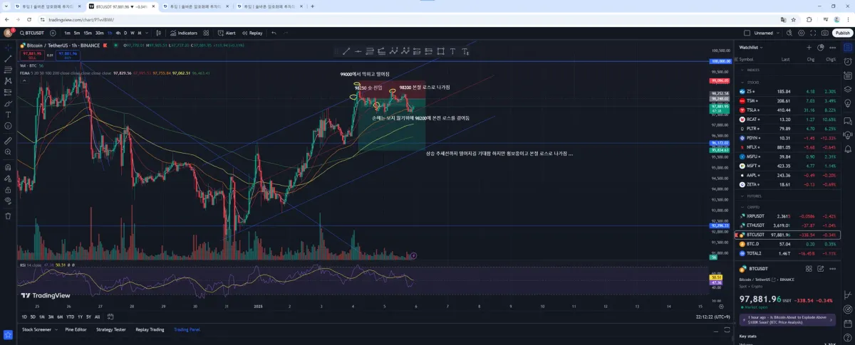 따라서 위의 상승추세선에서 저항을 받아 하락할 것이라 보고 98200원에서 숏을 진입하였고 99100에 스탑로스를 걸어놓고 잠에 들었습니다.
