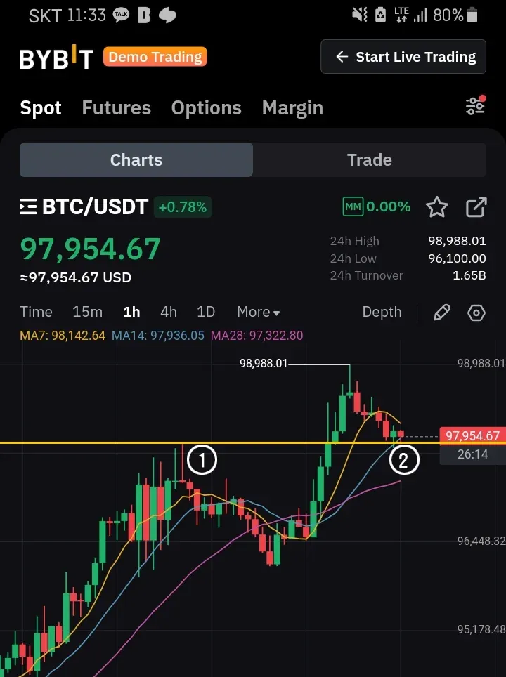 1번 저항, 2번에서 지지를 받아서 반등 할거라고 예측했고