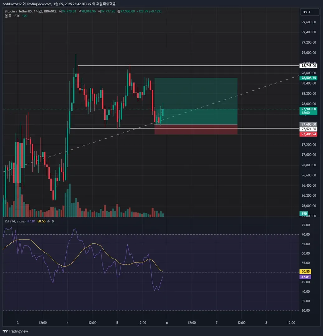 98500~97500 두 지점이 지지 저항으로 횡보로 예상하여, 97600 롱 진입 후, 수익 중에 있습니다.