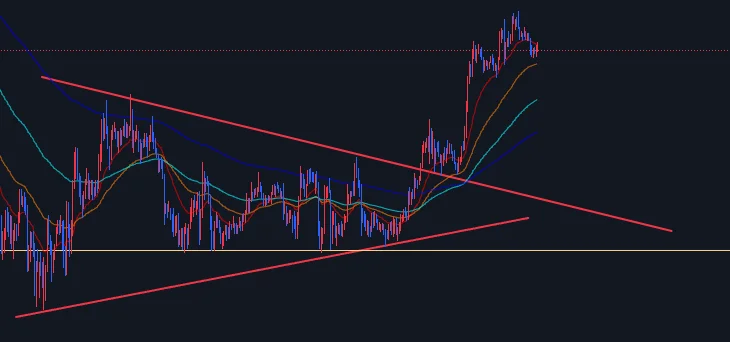 비트 코인이 여러번 조정이 나오는데도 이더리움은 3300부근 지지를 확실히 해주는 것 같은 느낌을 받았고 삼각수렴 바닥에서 맛보기로 롱포지션 진입 후 삼각수렴 돌파 후 리테스트 구간에서 롱포지션 본격 진입하여 현재 반 익절 후 반 홀딩 중입니다.