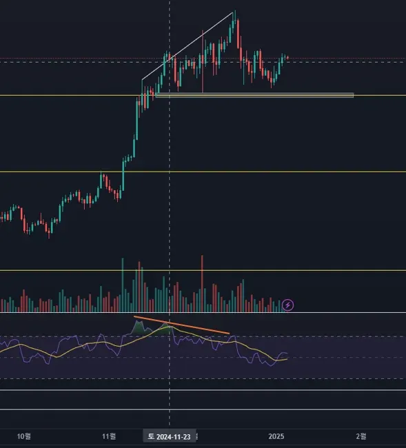 가격의 고점은 상승하고 있지만 RSI의 고점은 하락하고 있는 것을 볼 수 있다. 이후 비트코인 가격이 조정을 받았다.