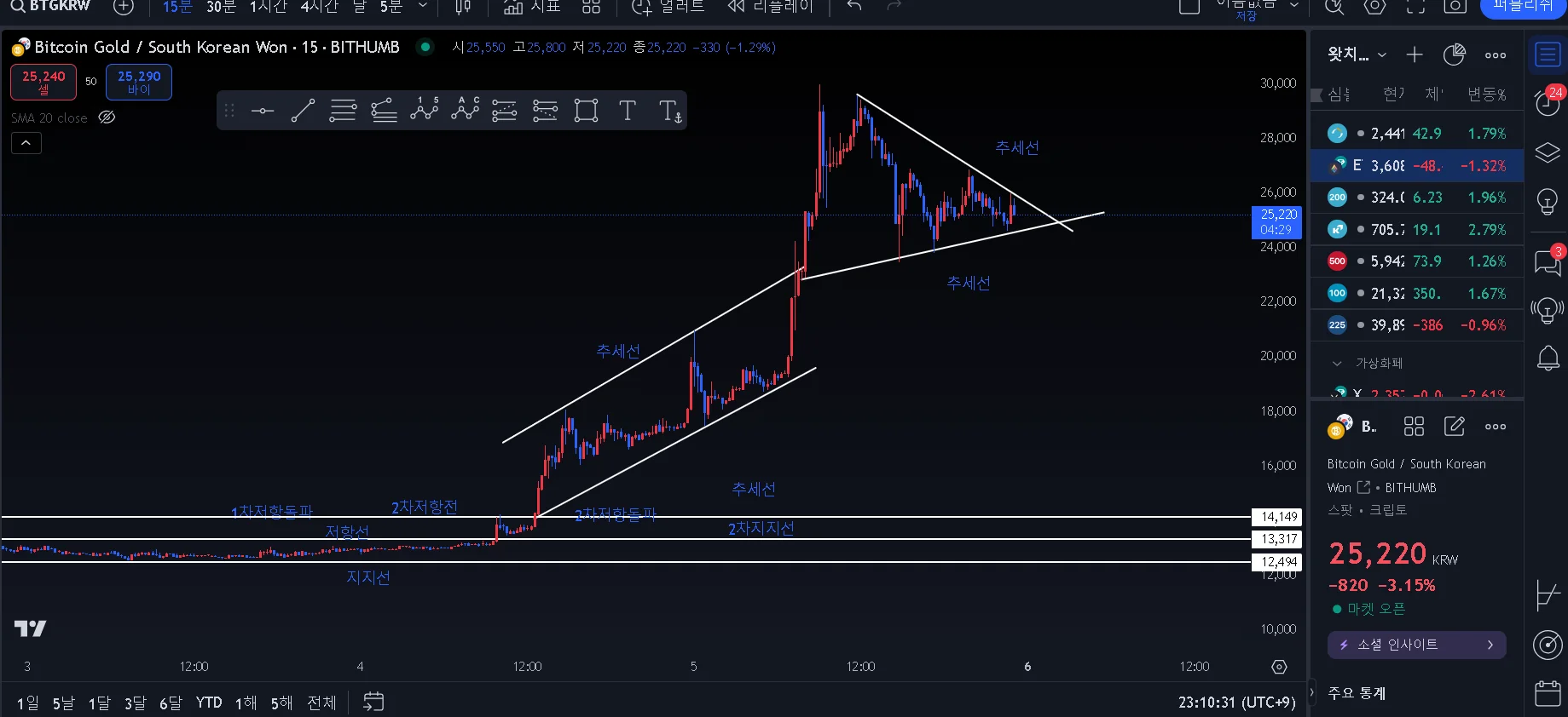 비트코인골드(BTG) 15분봉으로 작도를 해봤습니다