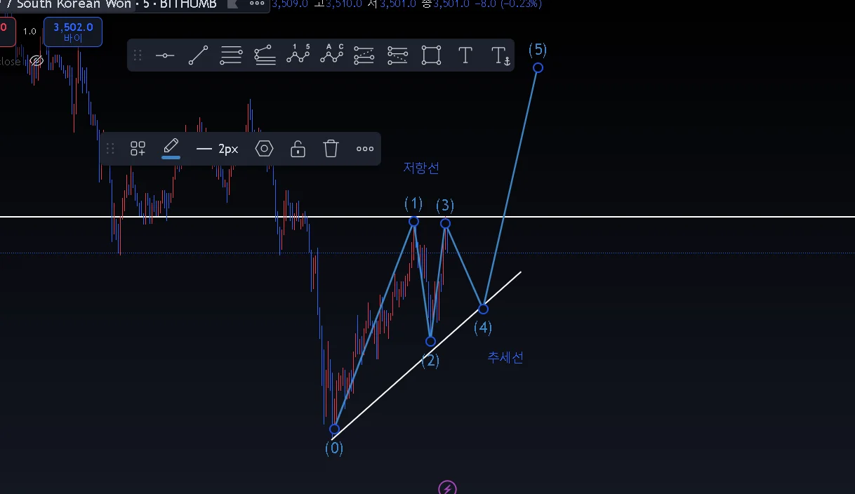 두번째로 리플(XPR)5분봉으로 작도를 해봤습니다. 현재 상승형 삼각수렴패턴으로 이제 곧 저항선을 뚫고리플의 상승추세가 예상됩니다