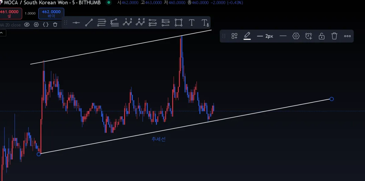 3번째로 모카버스의 5분봉을 작도해봤습니다 현재 상승추세에서 지금 코인차트가 지지선에 다다랐기 떄문에 다시 상승추세로 이어질것으로 예상이됩니다
