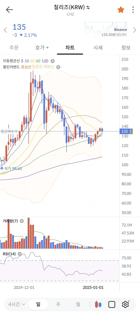 선물거래 관련해서는 모르는게 많아 좀더 공부하여 도전하겠습니다. 현물거래소는 빗썸이고 지난 12.3일 급락한 코인중 회복하지 못한 코인중에 거래량이 적고 RSI지수가 낮은 종목으로 매집구간으로 판단하여 손절구간 120원 손익은160원 생각하고 매수 하였습니다.