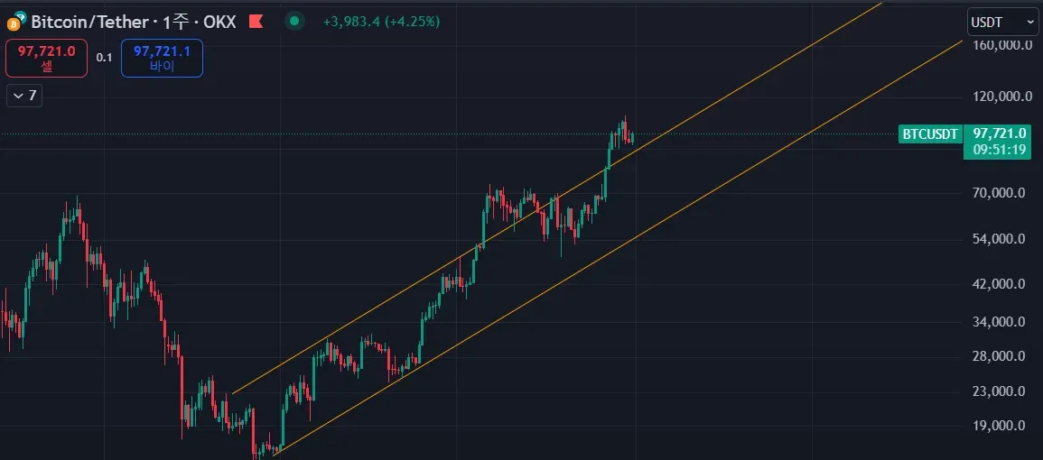 주봉으로 보는 비트코인은 여전히 아직은 상승추세를 유지하고 있다고 판단되고