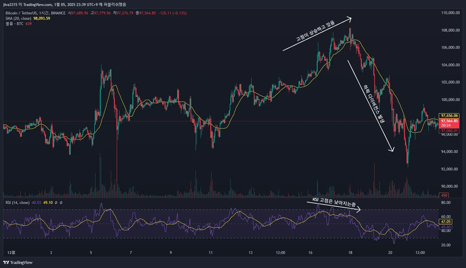 강의에서 들은대로 고점은 상승중인데 RSI 고점은 낮아지고 있었습니다 하락 다이버전스가 형성된 것이죠, 그이후에 비트코인의 가격이 하락한것을 볼수가 있었습니다