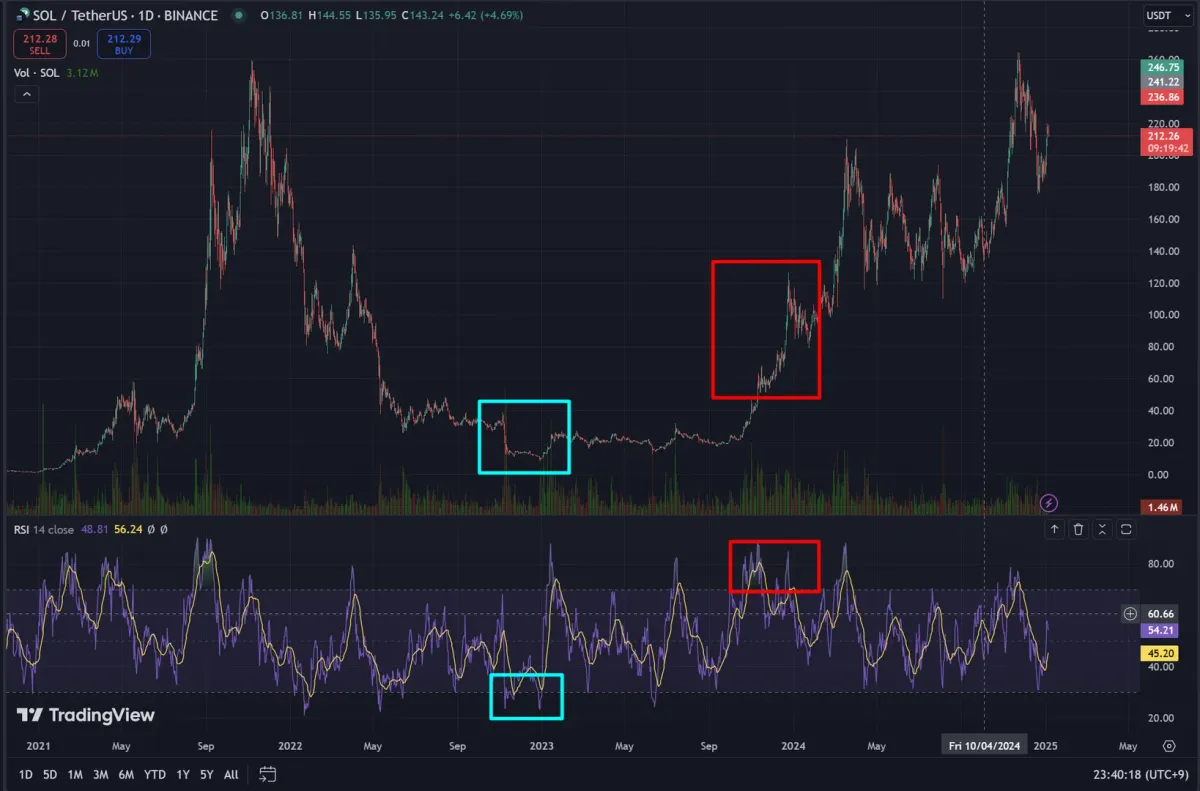 Solana/USDT의 Binance에서 14일 RSI (보라색)과 이평선(노란색) 입니다.