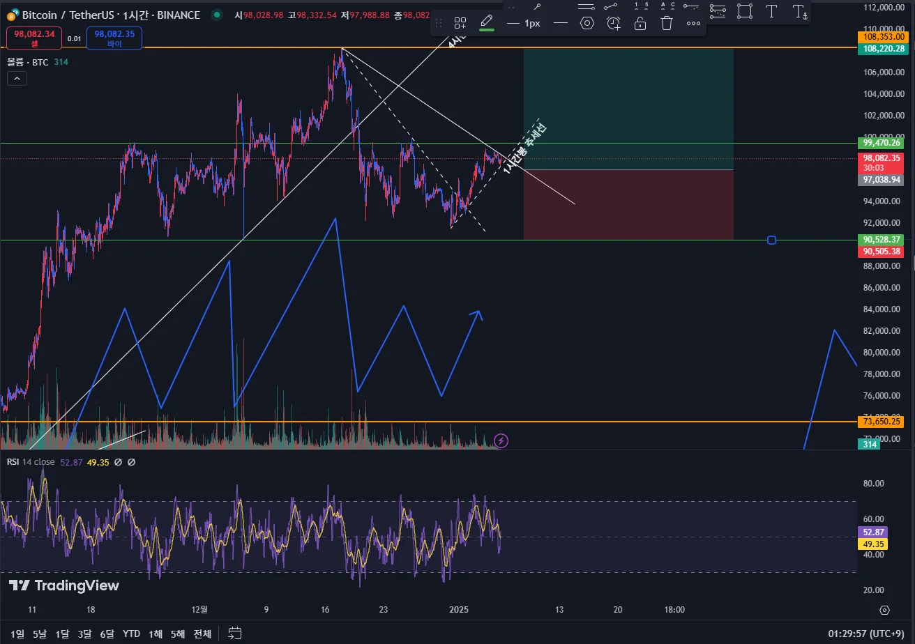 매수포지션 위치를 잘 못 설정해 뒀는데 99.47K를 돌파한다면 진입하여 짧게 롱으로 진입하면 될거 같다고 생각합니다.