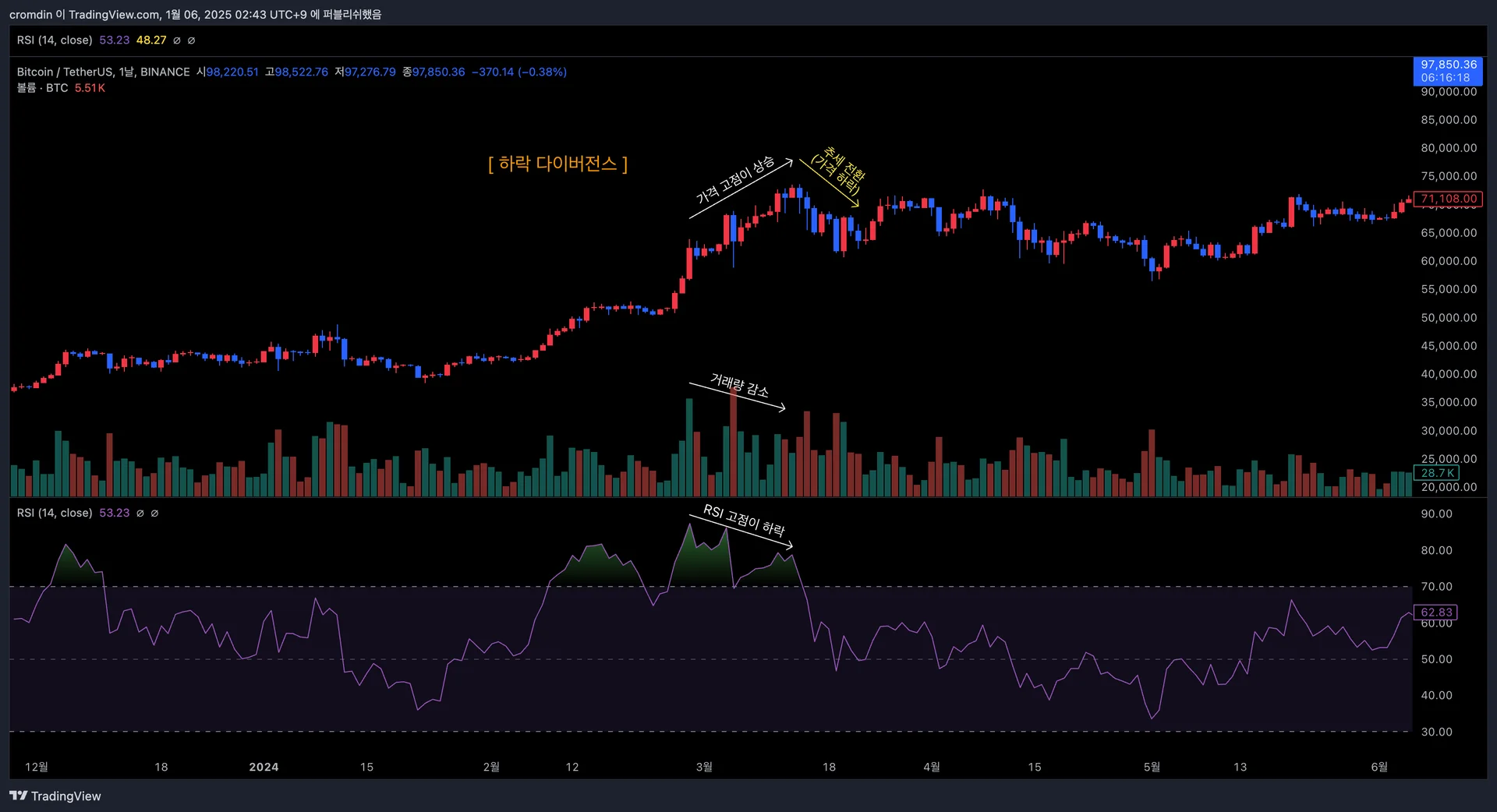 [ 하락 다이버전스 ] 가격 고점이 상승 중이나 RSI 고점은 하락 중으로 가격에 대한 상대적인 하락 압력 발생함. 거래량도 감소 중으로 시장의 관심이 줄었으나 일부의 기대감만으로 가격이 상승 중이며, 곧 상승 중 하락 추세 전환을 맞이함.