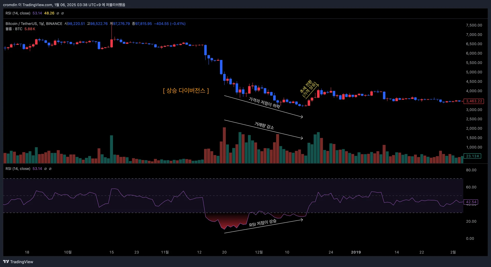 [ 상승 다이버전스 ] 가격 저점이 하락 중이나 RSI 저점은 상승 중으로 가격에 대한 상대적인 상승 압력 발생함. 거래량은 감소 중으로 가격 저점으로 인해 매수 대기의 긍정적인 신호로 볼 수 있으며, 곧 하락 중 상승 추세 전환을 맞이함.