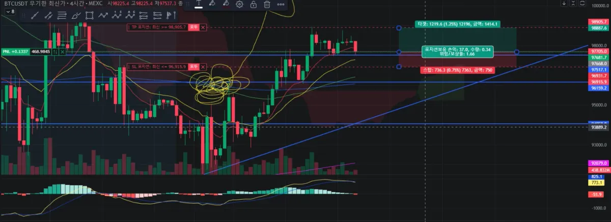 전고점부분 및 다음 저항대99,000목표 1.5손익비 9700 스탑로스잡고 진입해보았습니다.