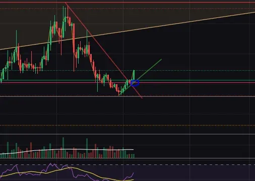 진입 근거: 하락추세선 넘기고 상승추세에서 수평지지라인 안착확인 롱진입했습니다. 다행히 장대봉 나와주었네요