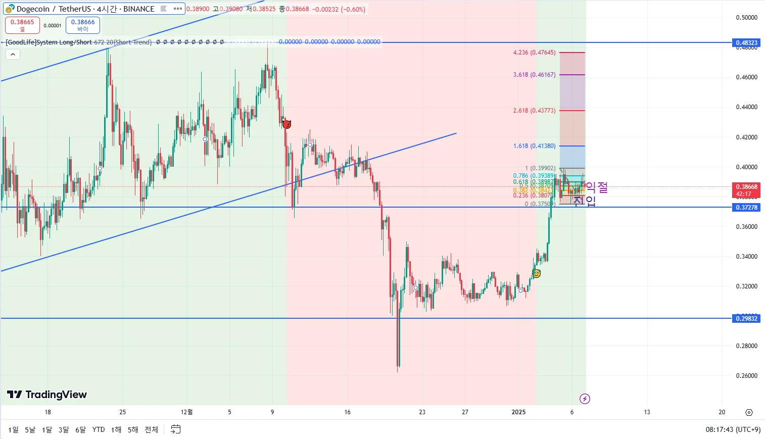 - 피보나치 0 구간이지만 이구간은 4시간봉 기준 상승 추세 후 저항선으로 작용했다고 판단