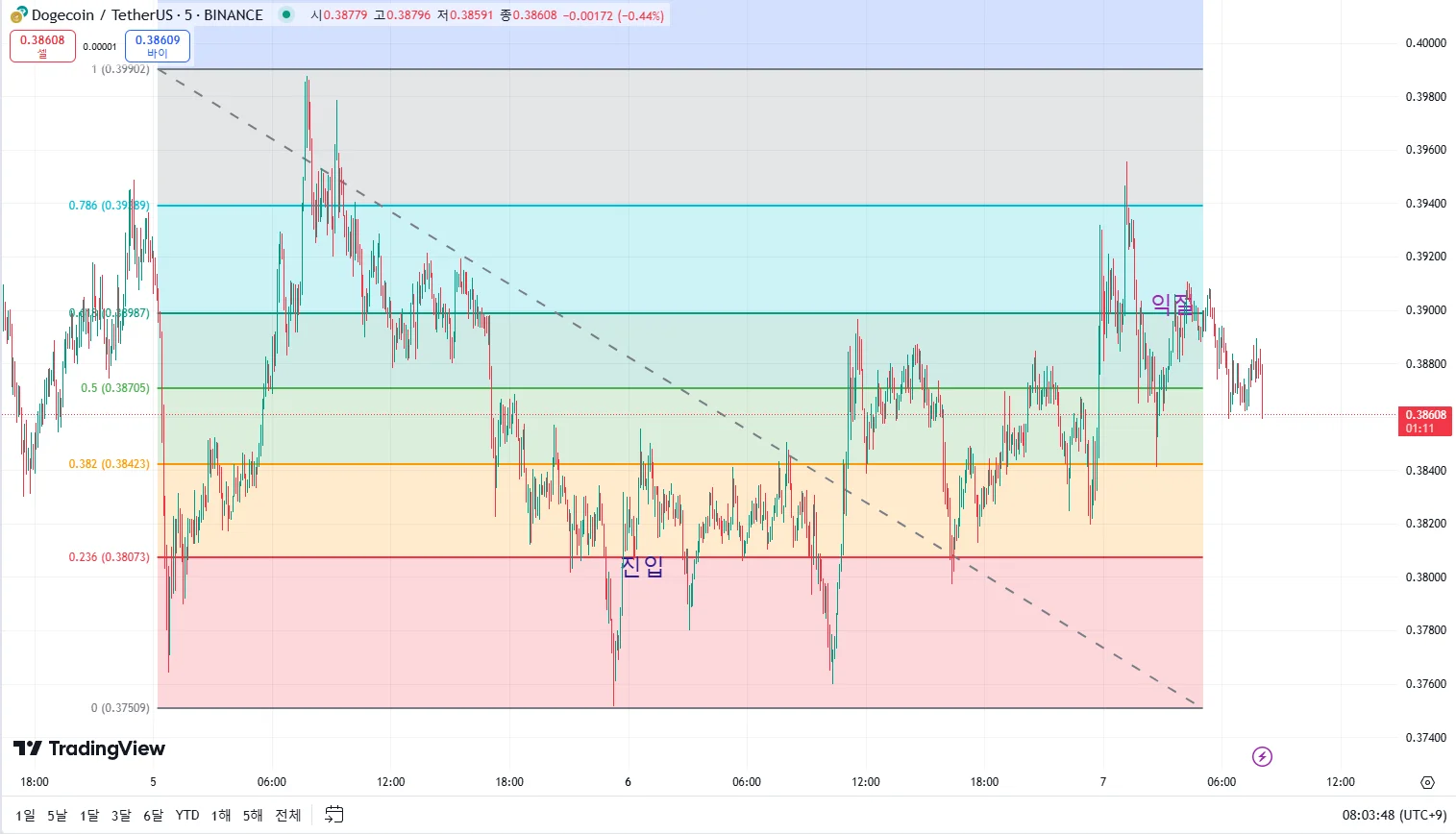 - 피보나치 0.786구간도 돌파 하였지만... 지정가 설정을 하지 못해 0.618구간에 익절