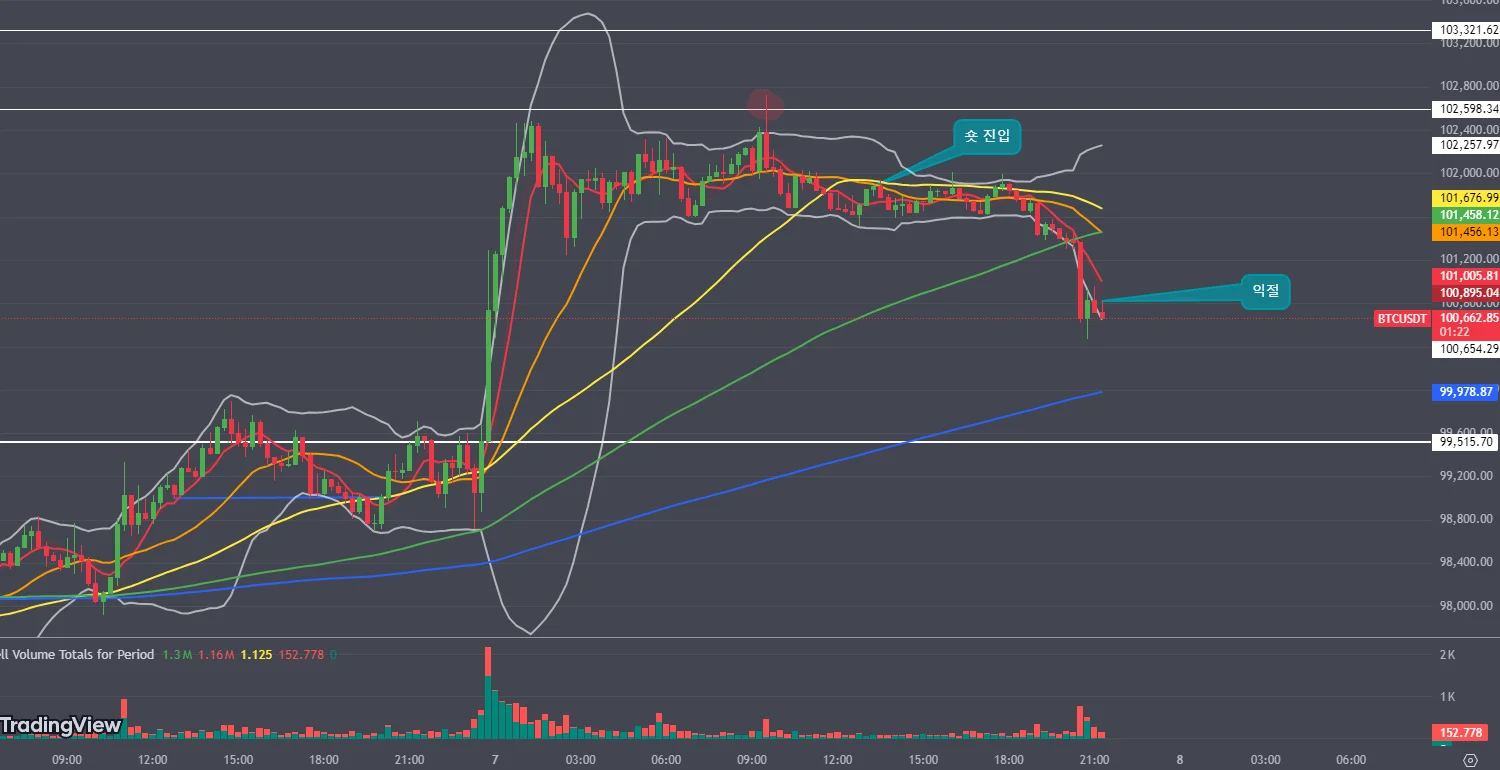 2025년 1월 7일 비트 15분봉 차트입니다. 어제는 비트가 폭등하면서 10만 돌파를 하더군요. 그래서 오전부터 박스권을 만들면서 횡보하는 상황이였습니다. 1차로 지지저항선에 터치하는 것을 보았고, 2차로는 각 캔들이 이평선을 못 넘기고 역배열로 전환이 될 수 있겠다 예상을 하고 숏진입을 하였습니다. 더 길게 가져가고 싶었지만 취침 매매는 아직 무리라고 생각하여 취침 전 익절하였습니다. 포지션 진입 후 약 6시간을 횡보하는 차트를 보는 과정에 인내심의 필요성을 느꼈습니다.^^ 소액으로 실투자를 조금씩하고 있지만 아직은 연습이 더 필요할 것 같습니다!