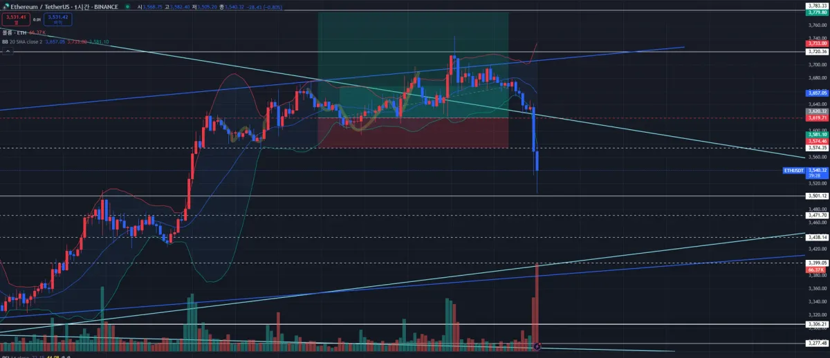 3620 지지선을 버텨주고 상단 추세선을 돌파 한다면 지속 상승을 예상하고 3620 자리가 오면 예약 롱을 걸고 4.4%가 상승하면 익절, -1.3%가 하락하면 손절가를 걸어두고