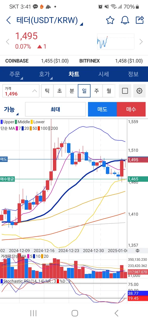 비트코인이 하락하고 있어서 테더가 볼린져밴드에 저항선으로 올라가지못하고 떨어질거 같아서 매도
