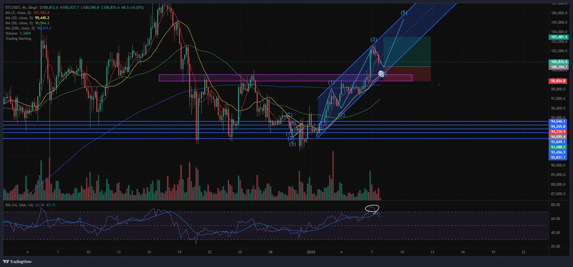 4시간봉 RSI 과매수를 내리고 채널하방에서 재차 상승파동 이어