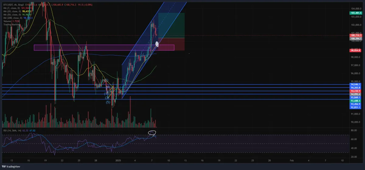 4시간봉 RSI 과매수를 내리고 채널하방에서 재차 상승파동 이어