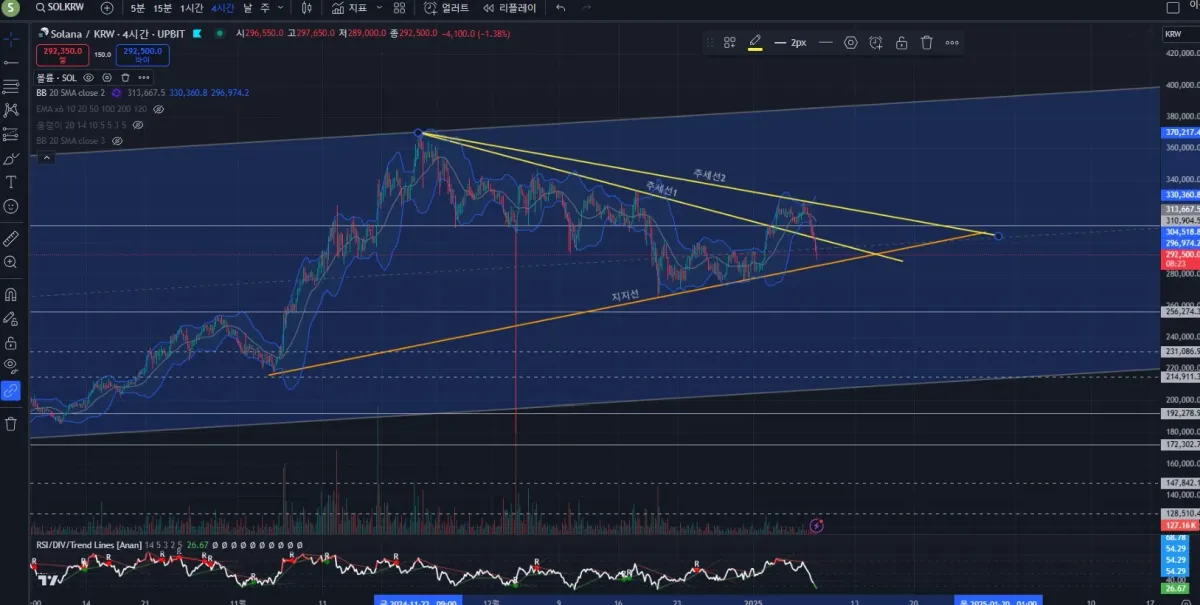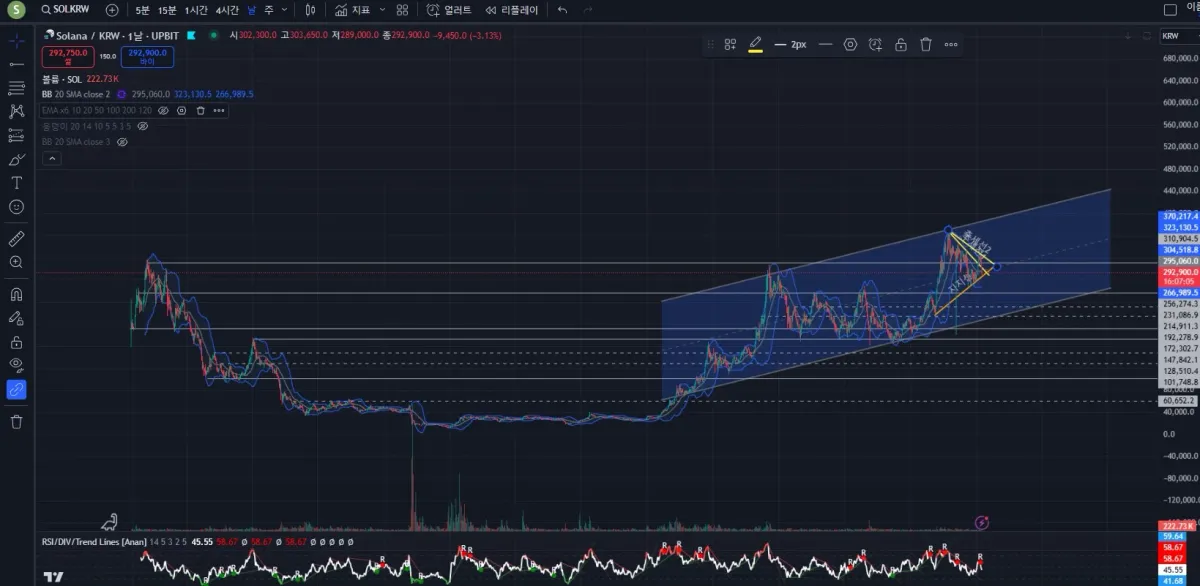 솔라나 1일 차트에서 패러렐채널에서 상단을 터치후 하락중 1/8일 갑작스런 하락 발생